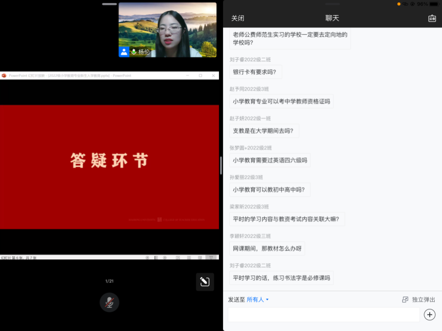 最后,在答疑环节中,俞淼老师和杨伦老师就可能出现的实习、党团关系、考研、教师资格证考试、普通话考试等内容向学生作了详细解答,并对2022级小学教育专业全体新生送上了寄语:“以智者的眼光关照教育现象,以仁者的民心推进教育发展,我们都是教育路上的追梦人。”