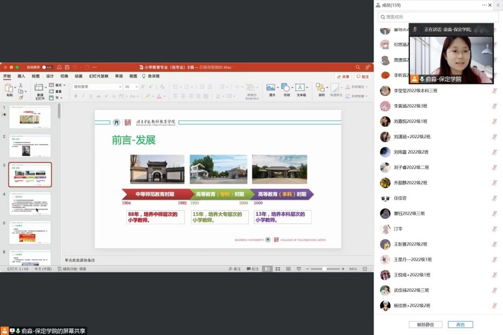 为使2022级小学教育专业同学能更好地适应大学新生活、更加深入解明升MS88、加深对小学教育专业的认识,2022年8月27日晚七点,小学教育专业教研室主任俞淼,专任教师杨伦、张卉、王若宁通过线上平台为2022级小学教育专业全体新生开展入学教育。活动主要从小学教育专业发展概况介绍、励志教育故事《十年》讲述以及答疑三个主要环节进行。