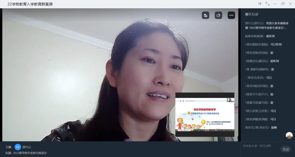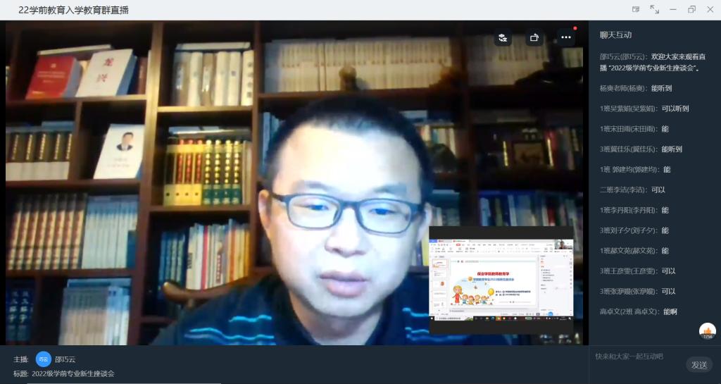 为使2022级学前教育专业同学能更好地适应大学新生活、更加深入解明升MS88学前教育专业,2022年8月27日晚七点,学前教育专业教研室主任邵巧云,专任教师于录艳、石安妮、纪元、王颐辰、靳琳、于海宁、仇方、杨爽等和 2022级新生的辅导员张羽老师通过线上交流的方式,在钉钉平台为2022级学前教育专业全体新生开展入学教育。
