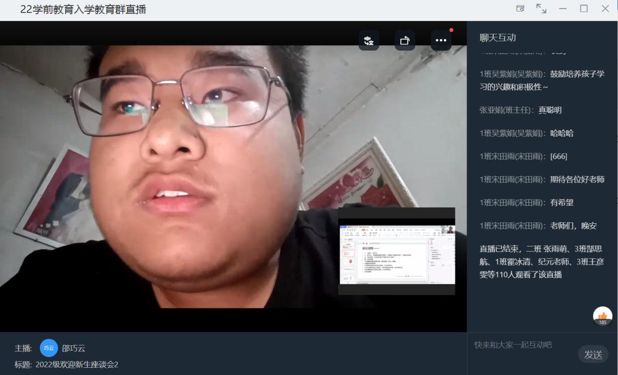 2022级新生的辅导员张羽老师曾是保院的学生也可以说是我们的老学长,他在致辞中讲到希望同学们在新的学期有新的开始,大学还是要以学习为主,不断充实自己,丰富大学生活,让自己的大学时光过得更加精彩。2022级新生也线上与老师进行了互动,2022级学前本科二班学弟郭雨坤大胆表达了自己心中的疑问,通过互动解决了疑惑、明确了方向。