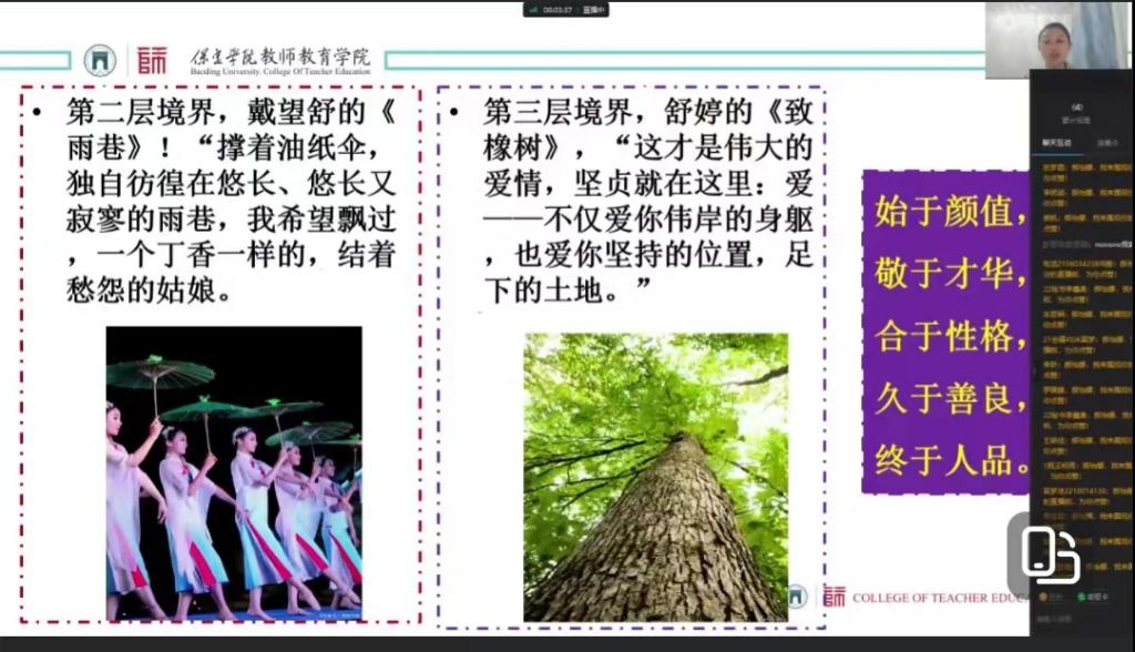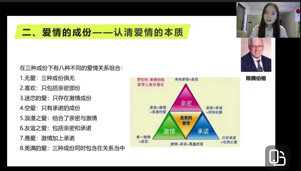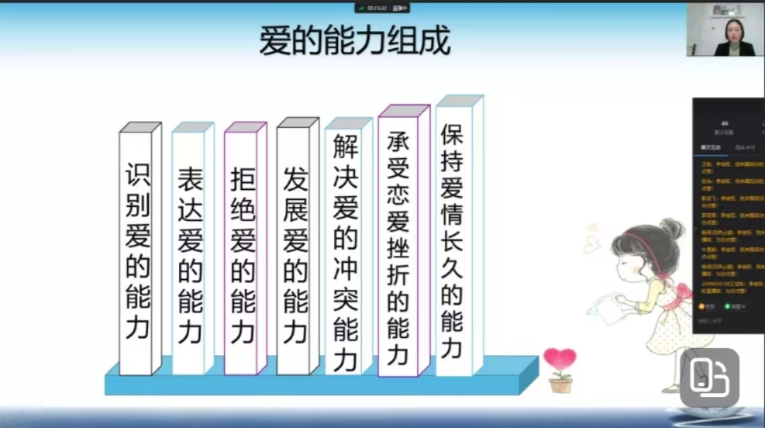 讲座选用钉钉平台,采取线上直播授课形式,王航老师、郝怡娜老师、李俊茹老师分别围绕“认知爱情”“恋爱误区”“爱的能力培养”三个方面进行阐述,教师风趣诙谐、亲切接地气的讲课风格,受到了广大学生们的热烈欢迎,在线人数逾4000人次,互动积极,效果良好。