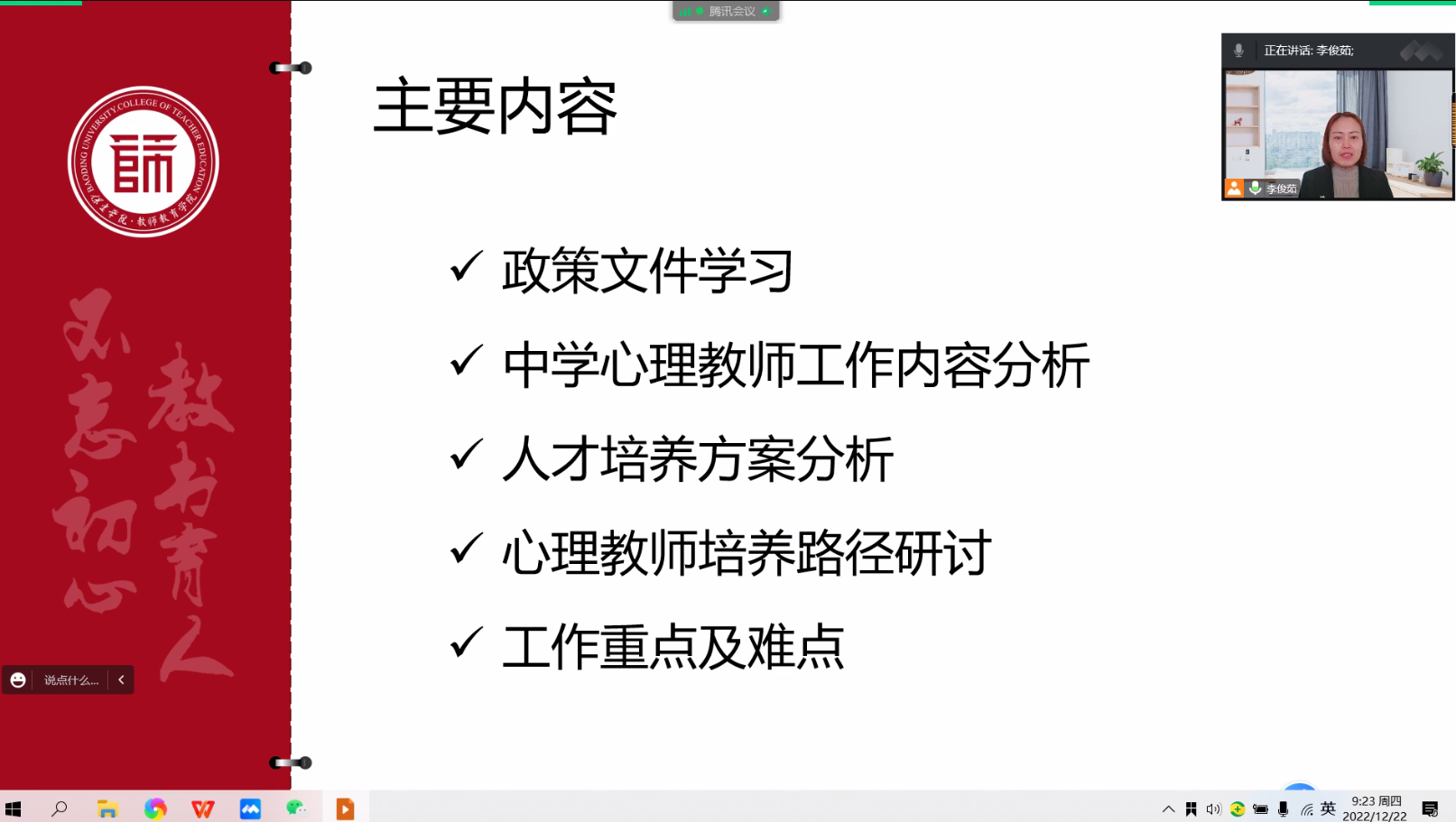 2022年12月22日至12月25日,应用心理学教研室9名教师积极参加了学院组织的院本培训活动。