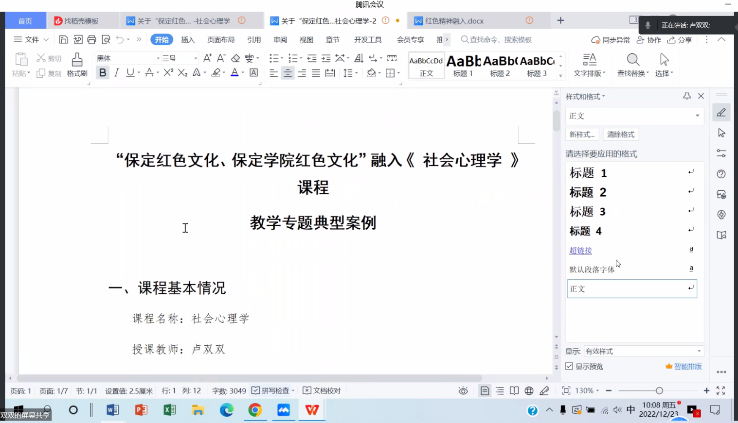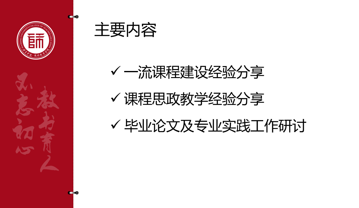 本学期老师们积极进行教学改革实践,一流课程建设和课程思政方面取得了较好的成绩。吴宪老师进行了校级一流课程《普通心理学》课程建设经验分享,为老师们建设一流课程提供了宝贵经验。卢双双老师的《社会心理学》和范星冉老师的《中小学心理辅导》入选“保定红色文化、明升MS88红色文化”融入课程教学专题典型案例,两位老师分享了课程思政教学设计,为大家展示了生动的课程思政实例。